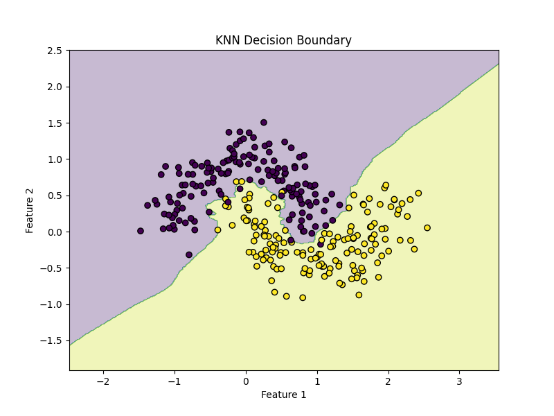 plot_decision_boundary(model, X, y)KNN can create very flexible nonlinear boundaries because predictions depend on local neighborhoods rather than a global linear equation.