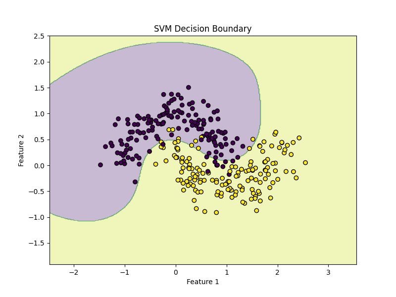 plot_decision_boundary(model, X, y)This plot helps you see how the RBF kernel creates a curved boundary.